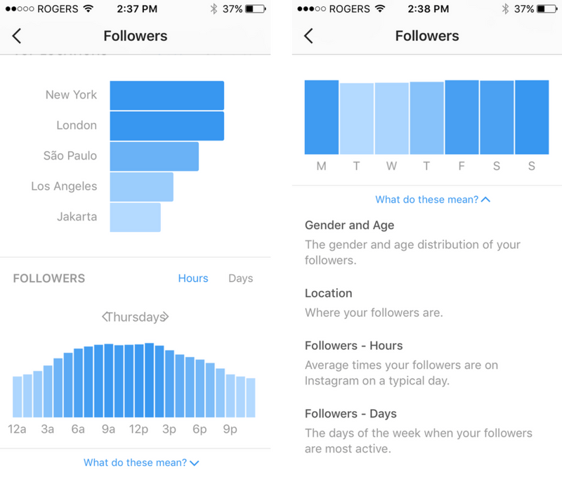 This section is called “Followers” for some reason, although it would be more correct to call it “Followers Activity”, because that is what it shows: at what time of the day and what days of the week your followers are most active on Instagram.