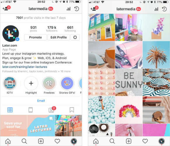 Keep in mind that square pictures or 4:5 aspect ratio (vertical rectangle) look best on instagram*. And 16:9 pictures, like from a computer, look narrow and visually stand out from the tape.