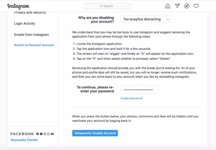 How long will instagram disable my account