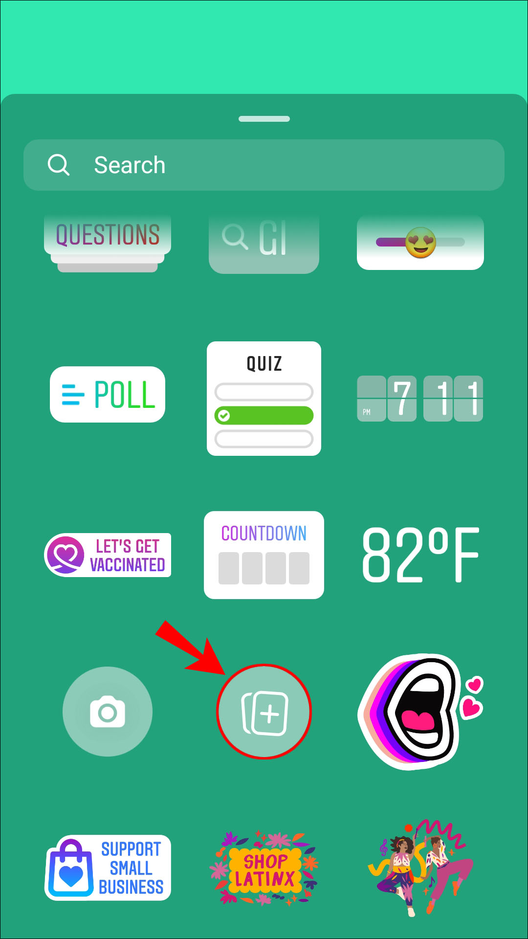 3. Tap the sticker icon at the top of the screen (the square with the smiling face). Scroll through the stickers to find the Camera Roll sticker: it’ll be a circle previewing your latest photo, with a logo of a mountain and sun overlaid on top.