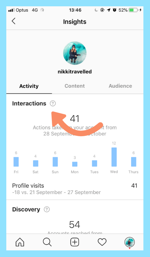 Under “Insights”, go to “Audience”. Here, you can see some vital statistics about your existing followers including their age range, gender and location.
