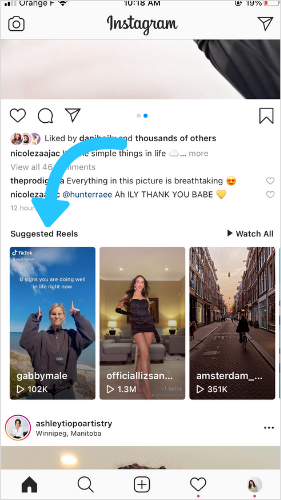 Users can also discover Reels in a dedicated section of the Instagram app. A scrollable feed full of trending Reels (a.k.a. Instagram’s version of the TikTok For You page) can be accessed through the Reels icon at the bottom of the Instagram app’s home page.