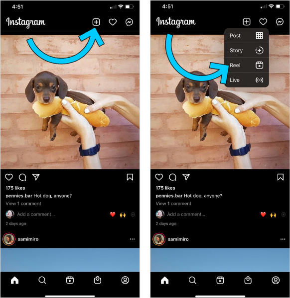 ReelTo access Reels, simply open the Instagram app and head to your profile page. Click the plus sign button on the top right of the screen and select Reel.