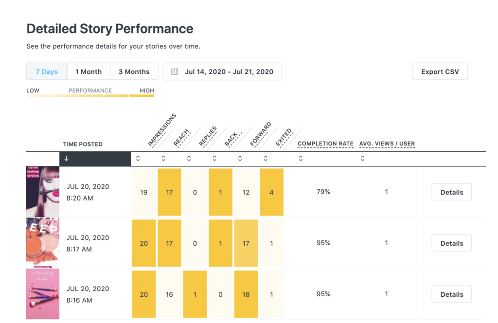 Statusbrew's Instagram Story Performance gives you an analysis of how your stories are performing w.r.t different metrics. You can also import Instagram Story Performance data by clicking on the three-dot menu beside the widget and selecting Export as CSV.