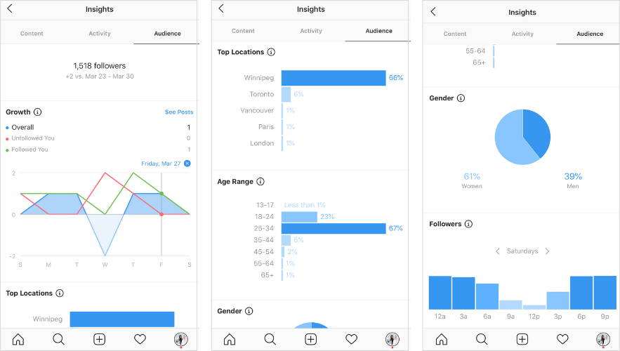 Select the Audience tab to see data on your followers, including when they access Instagram, as well as their location, age range, and gender. You can toggle between hours and days to view their most active times.