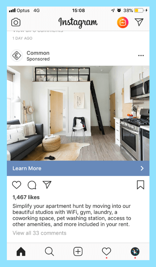 Similar to Facebook, Instagram ads appear throughout the app, including in users’ feeds, Stories, Explore, and more. They look similar to normal posts but always contain a “sponsored” label to indicate that they are an ad. They also often have more features than a normal post, such as links, CTA buttons, and product catalogs.
