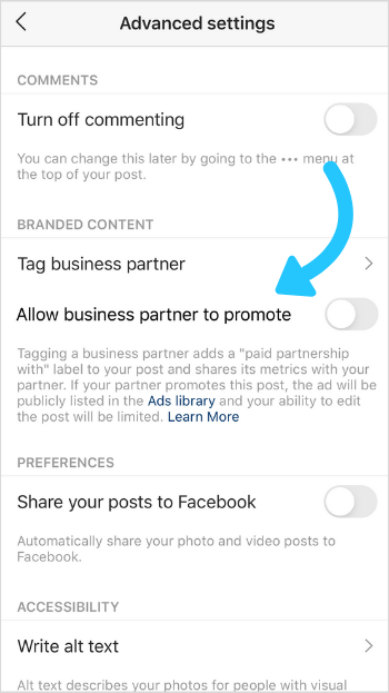 - Allowing your brand partner to promote the branded content via feed or story ads – if you give them permission.